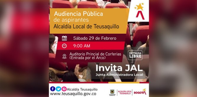 El próximo sábado 29 de febrero se desarrollará la audiencia pública de aspirantes al cargo de Alcalde o Alcaldesa local de Teusaquillo, donde cada candidata y candidato expondrá ante la comunidad sus ideas, propuestas y visión de trabajo para la localidad, este proceso es completamente abierto a la ciudadanía, así que, si quieres participar, no dudes en acercarte, la entrada es libre para todos los interesados.