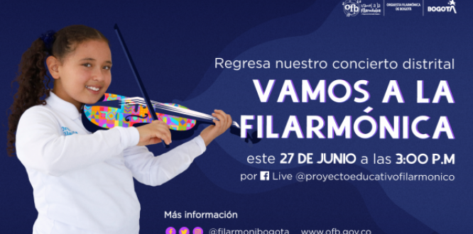 Esta será la primera vez en la historia del Concierto Distrital que será transmitido por medio de canales digitales, una oportunidad para que toda la familia se reúna a disfrutar de lo mejor de la música que los niños, niñas y jóvenes del proyecto Vamos a la Filarmónica han ido aprendiendo en su proceso formativo musical. El proyecto de formación musical de la Filarmónica de Bogotá suma actualmente 23.000 niños, niñas, jóvenes y adolescentes entre los 7 y 17 años, quienes se benefician de esta propuesta y reciben formación musical gratuita en orquestas filarmónicas, bandas, coros, ensambles de cuerdas pulsadas, iniciación musical y rítmica corporal, para desarrollar sus talentos y propiciar su educación como ciudadanos integrales.