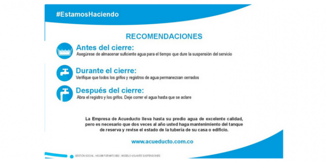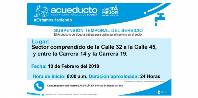 Nos permitimos informar que, para optimizar el servicio en el sector, la Empresa de Acueducto realizará una suspensión temporal del servicio este 13 de febrero, a partir de las 8:00 a.m. y durante 24 horas. La medida cobijará los sectores comprendidos entre las calles 32 y 45, y las carreras 14 y 19. Los invitamos a recolectar previamente el vital líquido para solventar dicho plan de mejora.
